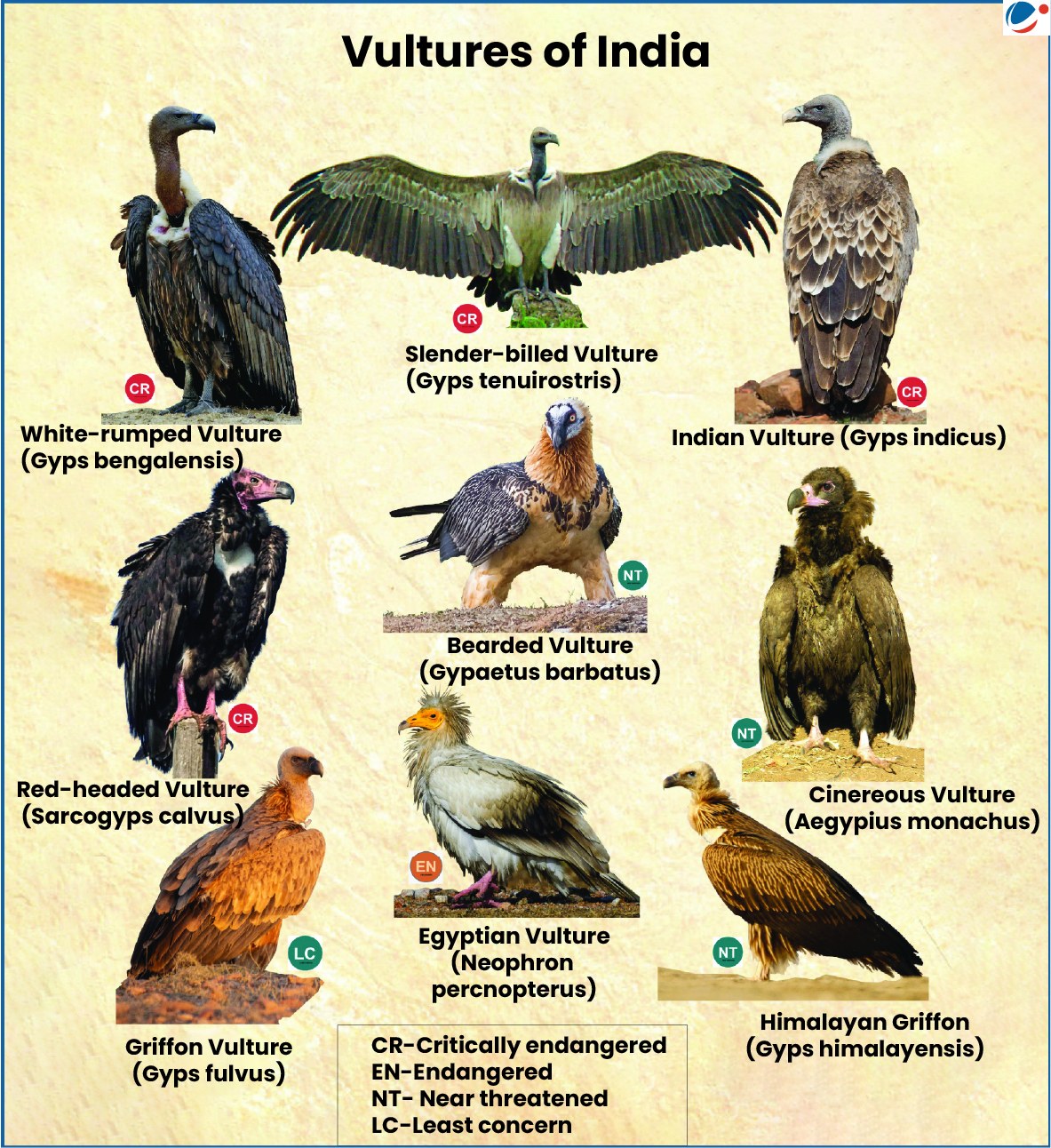 - Indian Vulture (Gyps indicus): Found mainly in Madhya Pradesh & Rajasthan (largest at Mukundra Hills); reliant on secure cliff sites