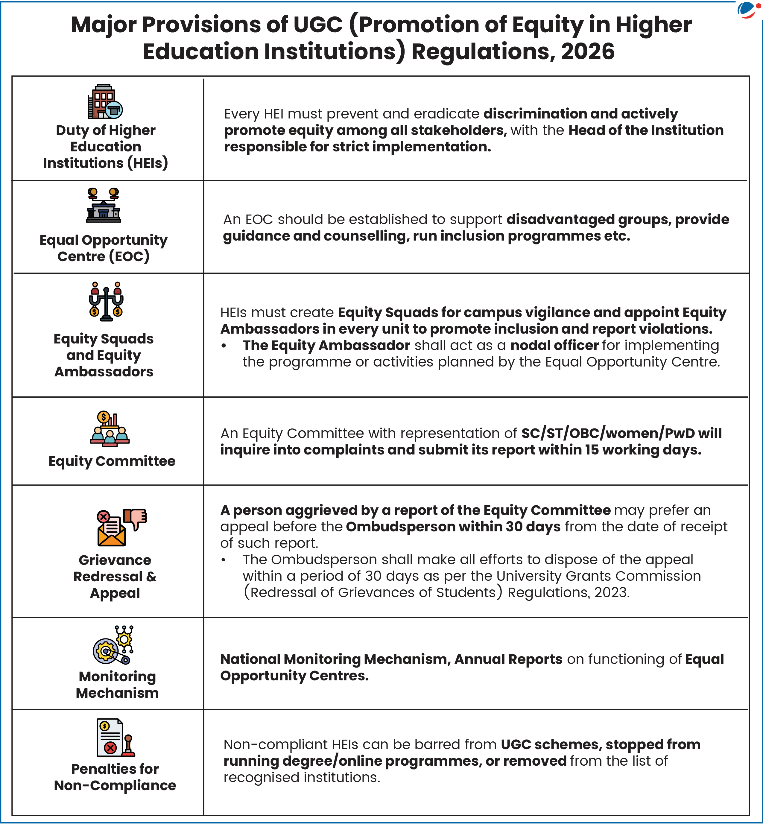 - UGC’s new regulations aim to eliminate discrimination in higher education on the grounds of caste, religion, gender, race, place of birth, or disability, especially against SCs, STs, OBCs, EWS and Persons with Disabilities.