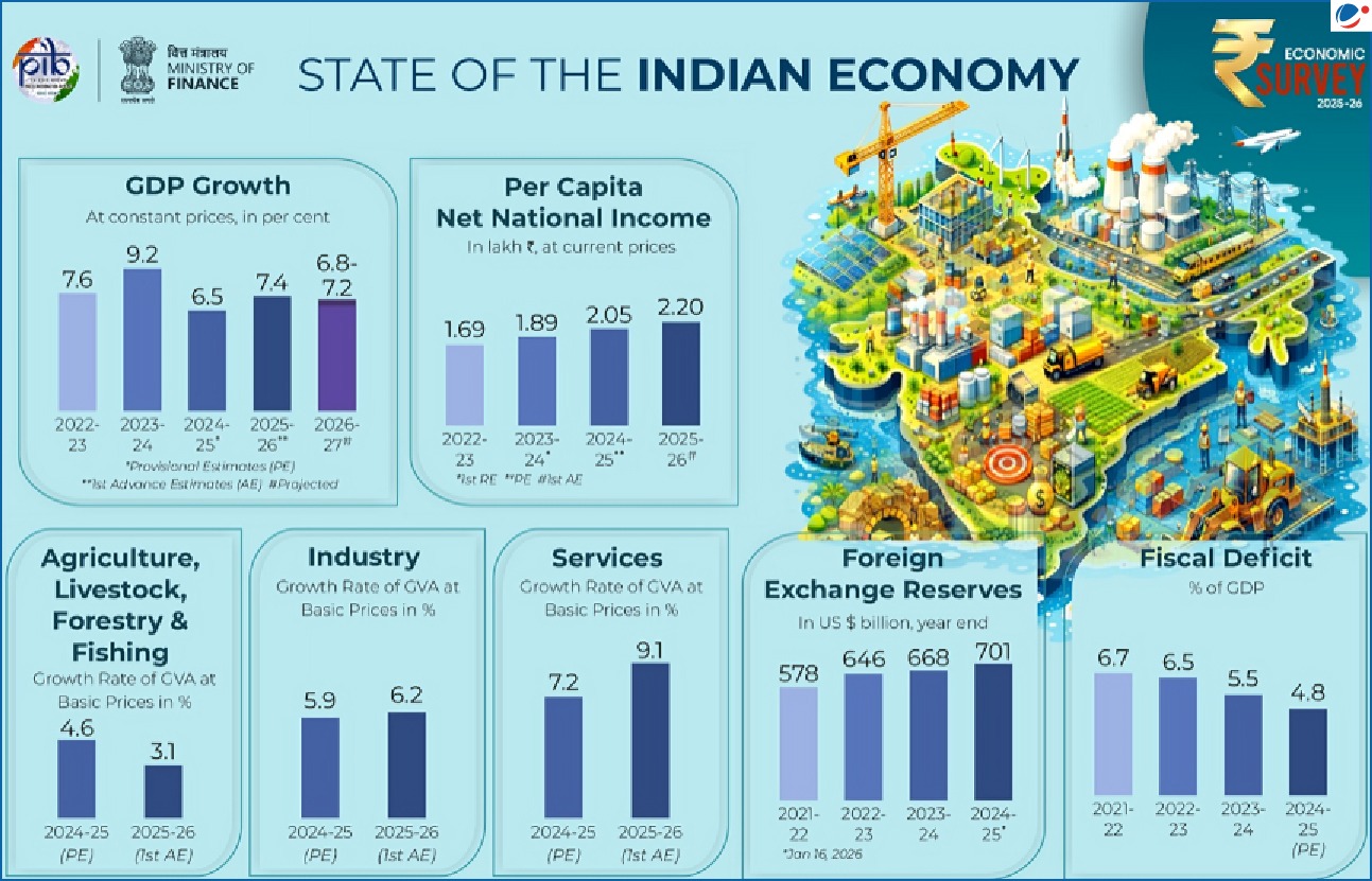 • India's economy projected to grow at 7.4% in FY26, driven by domestic demand and services sector growth.