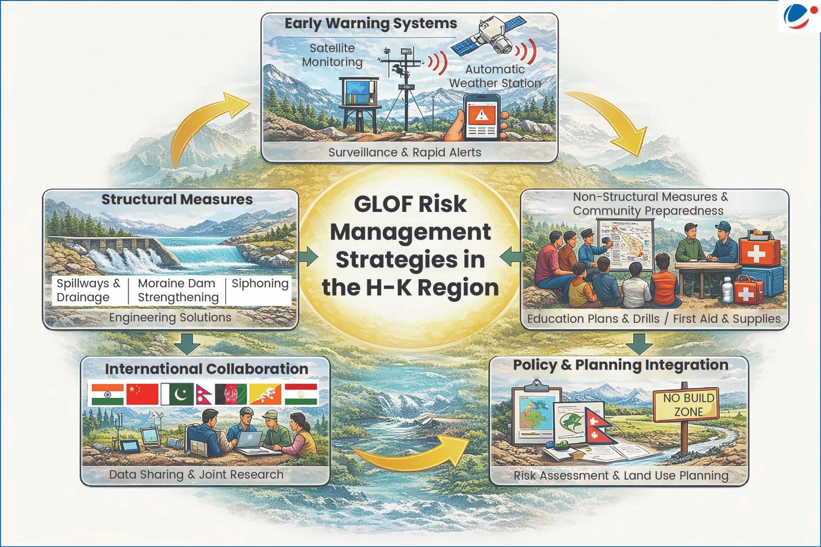 • GLOFs threaten approximately one million people living near glacial lakes, damage infrastructure, and can create transboundary risks between countries like China, Nepal, and India.