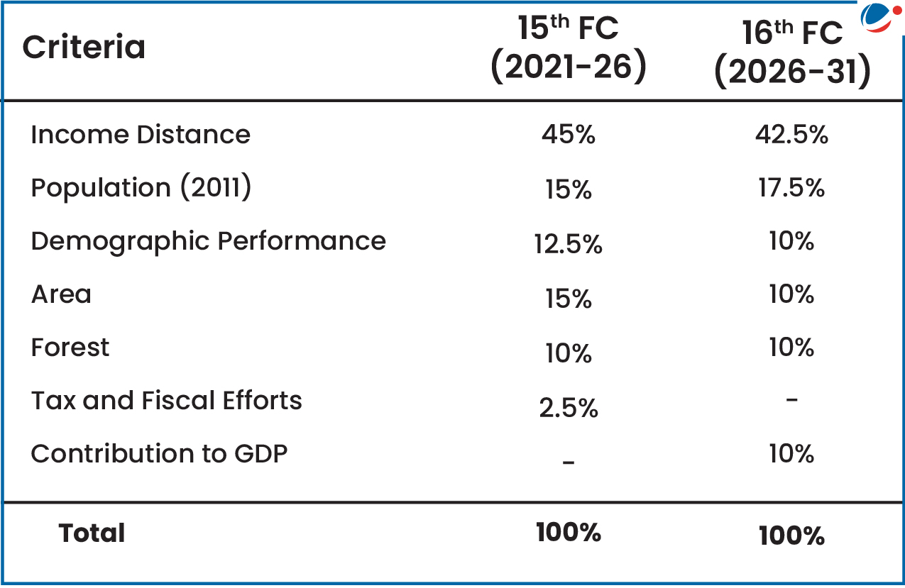 - Southern States will see higher devolution due to inclusion of Contribution to GDP as a criteria, reduced weightage to Income distance and area.