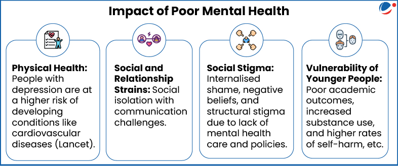 • Financial Protection: Through Ayushman Bharat PM-JAY, mental health conditions are covered under Rs. 5 lakh per family annual insurance.