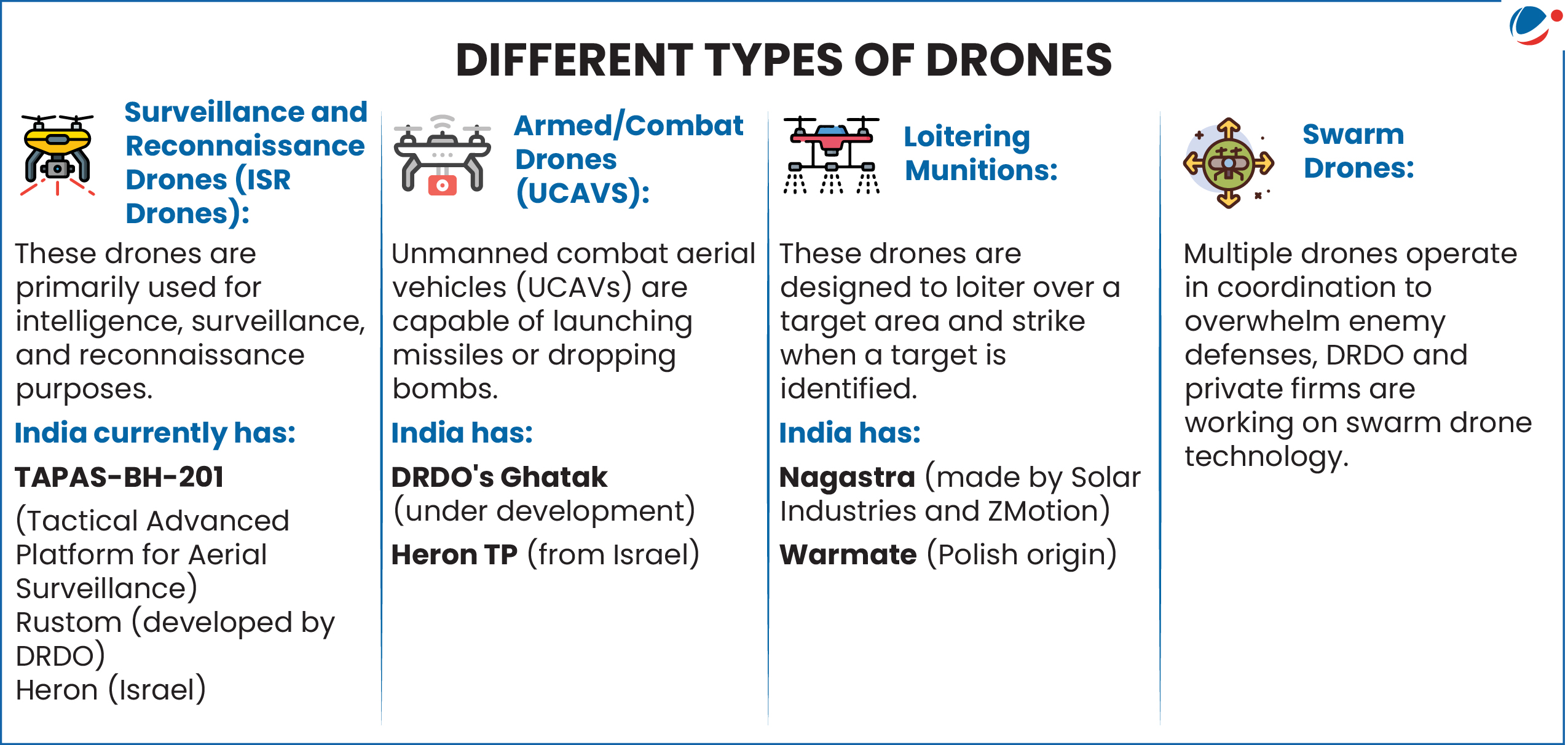- Defence Applications: Drones enable border surveillance, intelligence gathering and precision strikes; integrated with radar and air-defence networks, they enhance rapid threat detection and protection of critical infrastructure (e.g., Operation Sindoor).