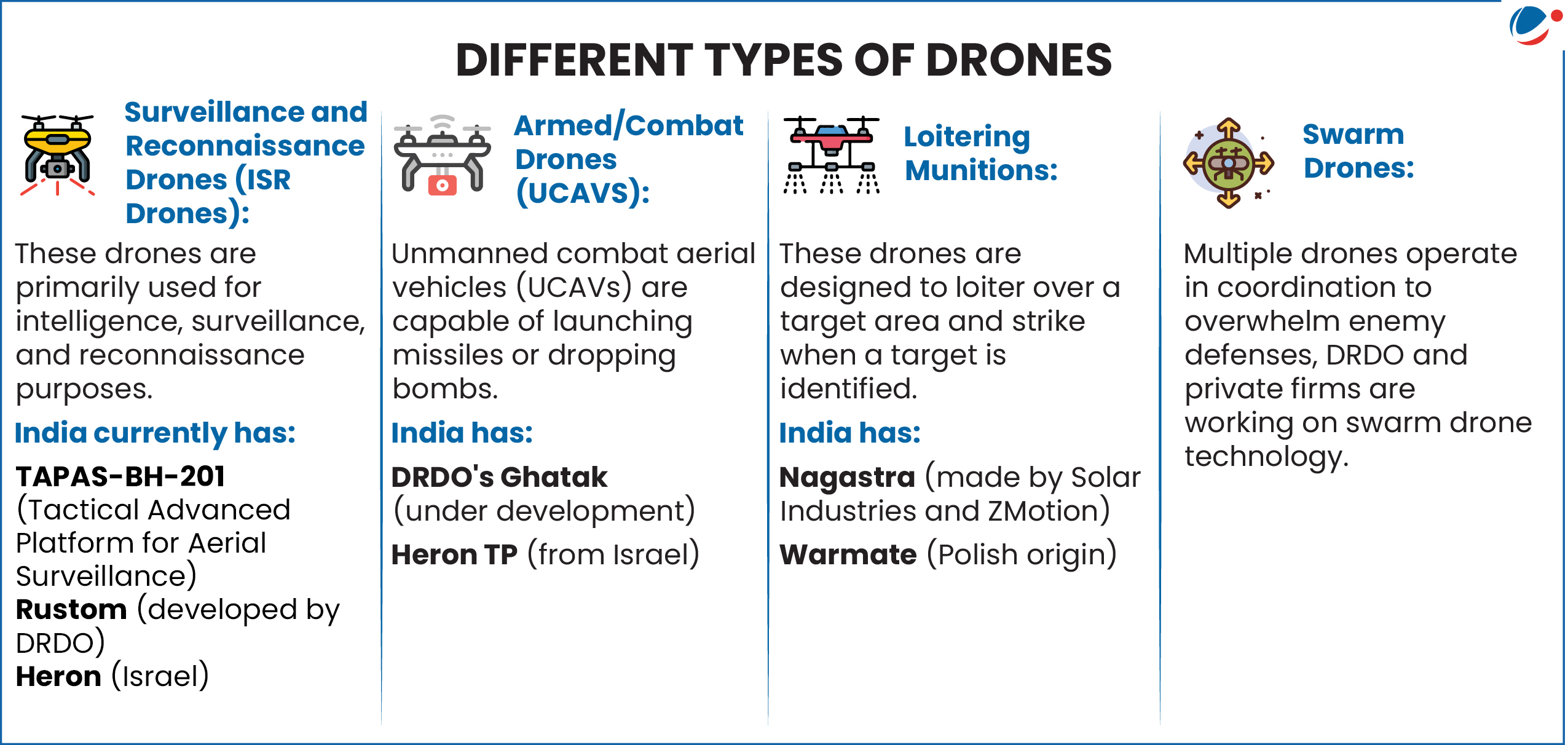 • Import Policy: Government announced import ban on drones in CBU (Completely Built-Up), SKD (Semi-Knocked Down), and CKD (Completely Knocked Down) units.