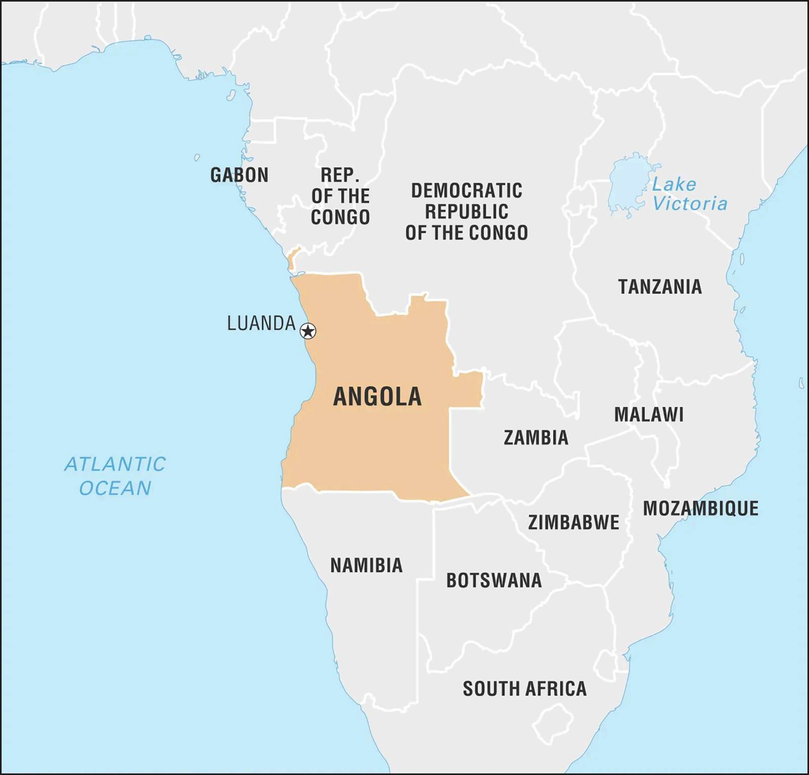 - Bordering Nations: Democratic Republic of the Congo (North and East), Republic of the Congo (Northwest via the Cabinda exclave), Zambia (East), Namibia (South).