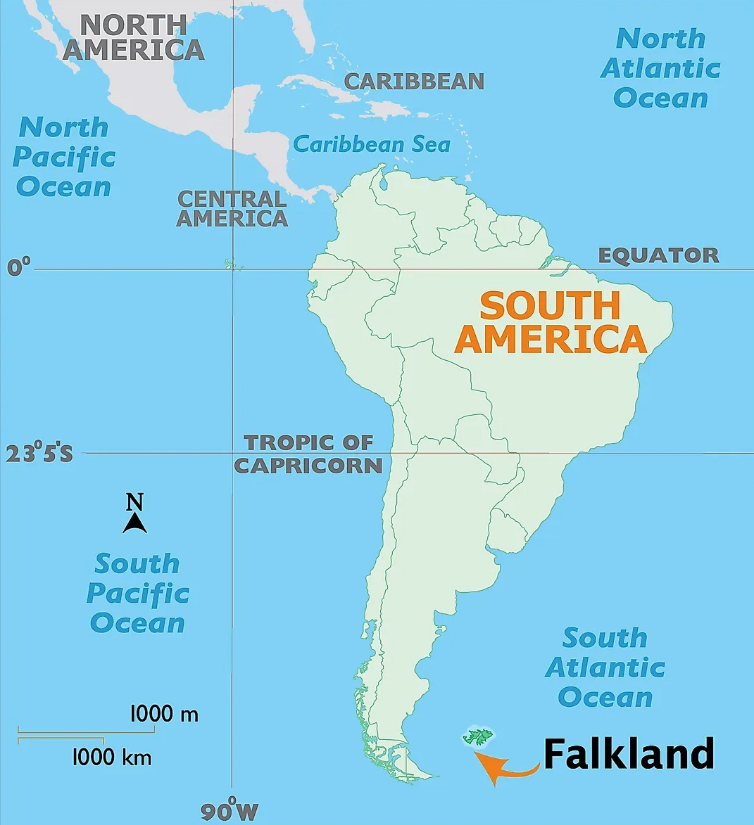 •  It lies about 480 km northeast of the southern tip of South America and a similar distance east of the Strait of Magellan.