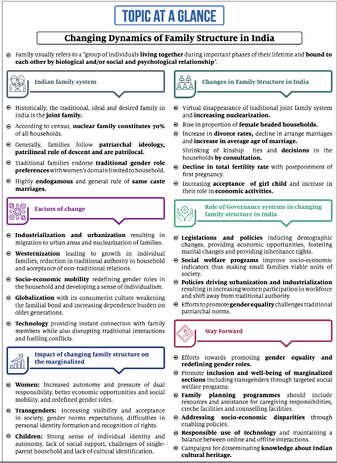 The family has been a foundational institution of society in most parts of the world, particularly in India. However, types of family vary in internal organisation, in its degree of autonomy and in sanctions and taboos by which it is protected and perpetuated. The dynamics of family structure in India have undergone significant transformations over the years, reflecting the intricate interplay between tradition, modernity, socio-economic factors, and cultural shifts. Such transformation is emblematic of the broader structural transformations occurring within Indian society, influenced by urbanization, globalization, educational attainment, changing gender roles, and advancements in technology.
