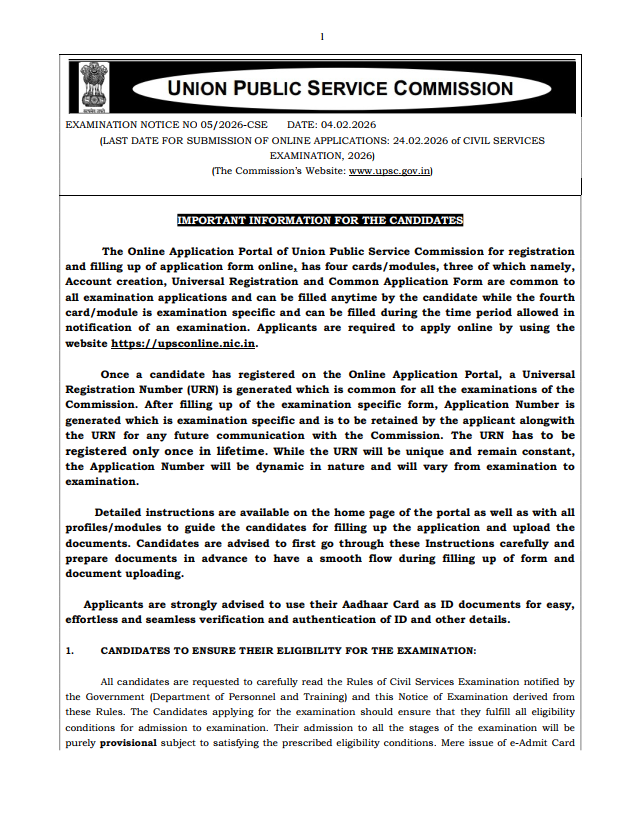 The UPSC 2026 notification has been officially released by the Union Public Service Commission on 4th February 2026 , marking the formal beginning of the UPSC 2026 examination cycle.